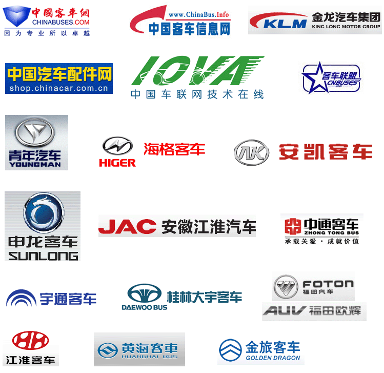 中国客车网 | 中国客车信息网 | 中国客车联盟 | 中国客车配件网 | 中国车联网时代 | 厦门金龙客车(厦门金龙汽车集团股份有限公司) | 青年汽车(中国青年汽车集团) | 苏州金龙/海格客车 | 上海申龙客车 | 安徽安凯汽车(安徽安凯股份有限公司) | 安徽江淮客车 | 中通客车 | 宇通客车 | 桂林大宇客车 | 福田(欧辉)客车 | 黄海客车 | 厦门金旅客车
