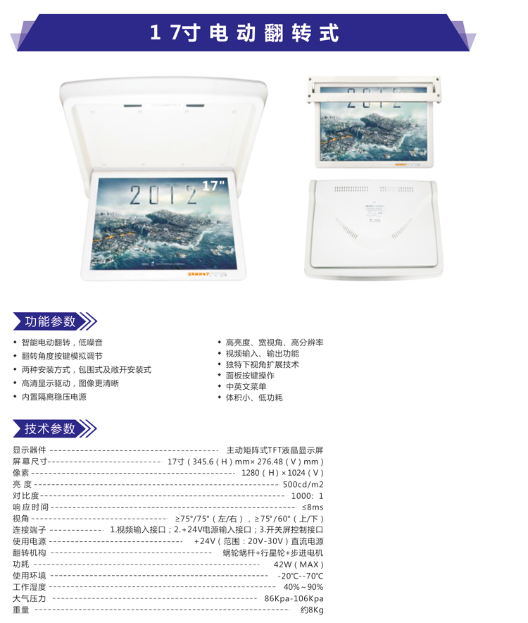 产品展示 您现在的位置:首页 > 产品展示页 > 液晶显示器系列 > 17寸电动翻转式